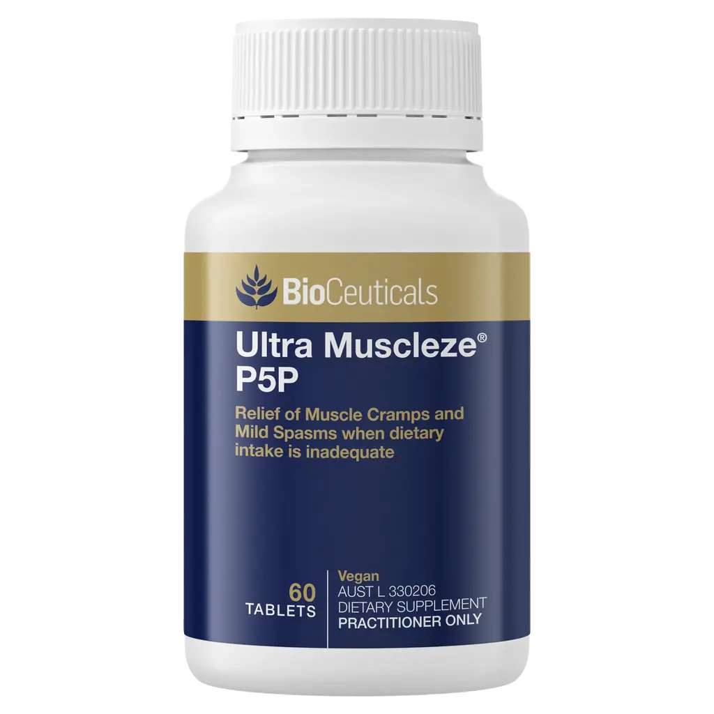 Ultra Muscleze® P5P featuring UltraMag® is a proprietary blend containing magnesium glycinate, which is highly bioavailable and gentle on the stomach. Magnesium assists with the relief of muscle cramps and mild muscle spasms when dietary intake is inadequate. Magnesium also supports muscle function, bone health, nerve conduction and cardiovascular system health. Both magnesium and vitamin B6 support energy production and nervous system function, as well as relieving fatigue. Vitamin B6 aids in the synthesis of neurotransmitters and supports a healthy stress response in the body. Part of BioCeuticals range of muscle supplements.