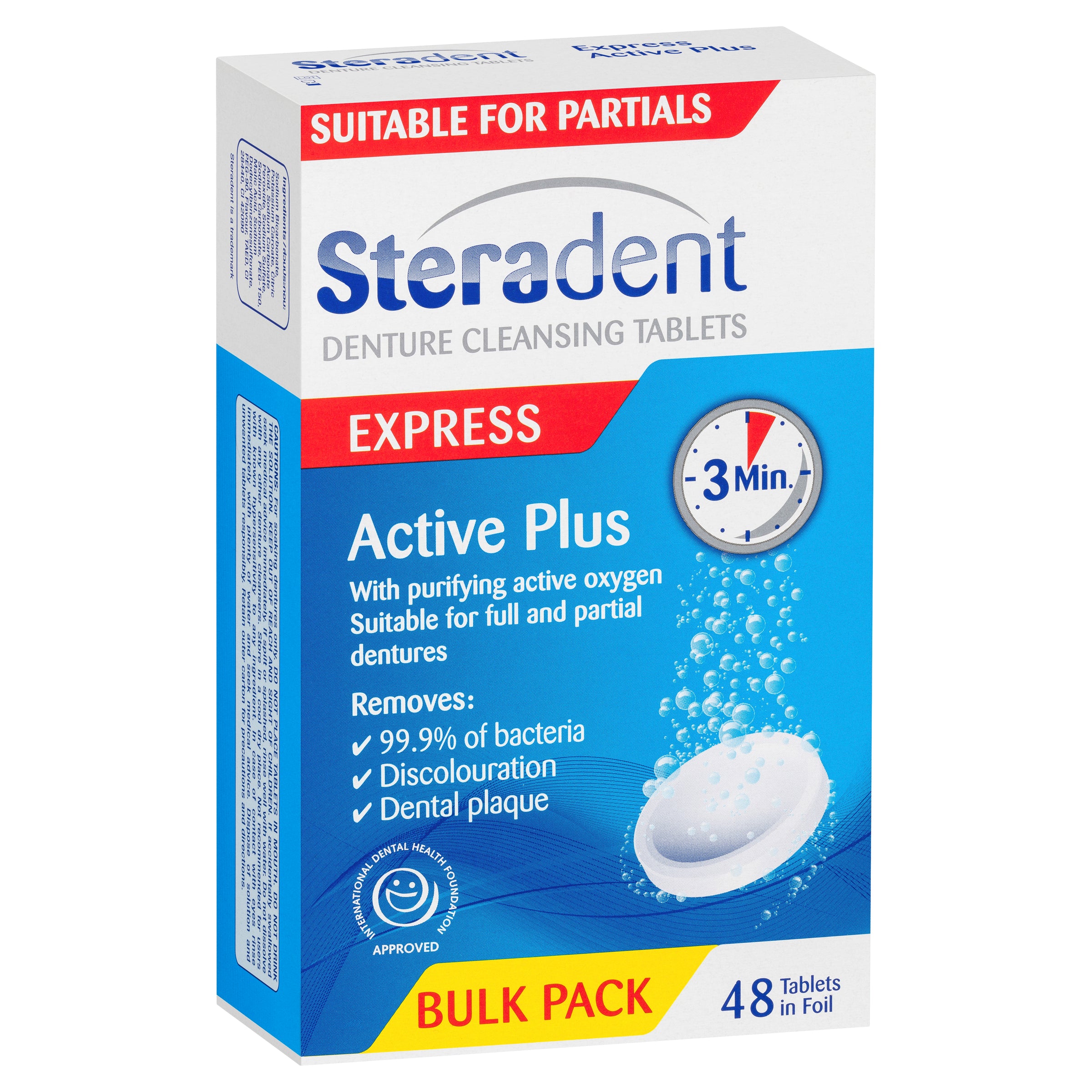 Steradent Active Plus Denture Cleansing Tablets with purifying active oxygen removes 99.9% of bacteria.